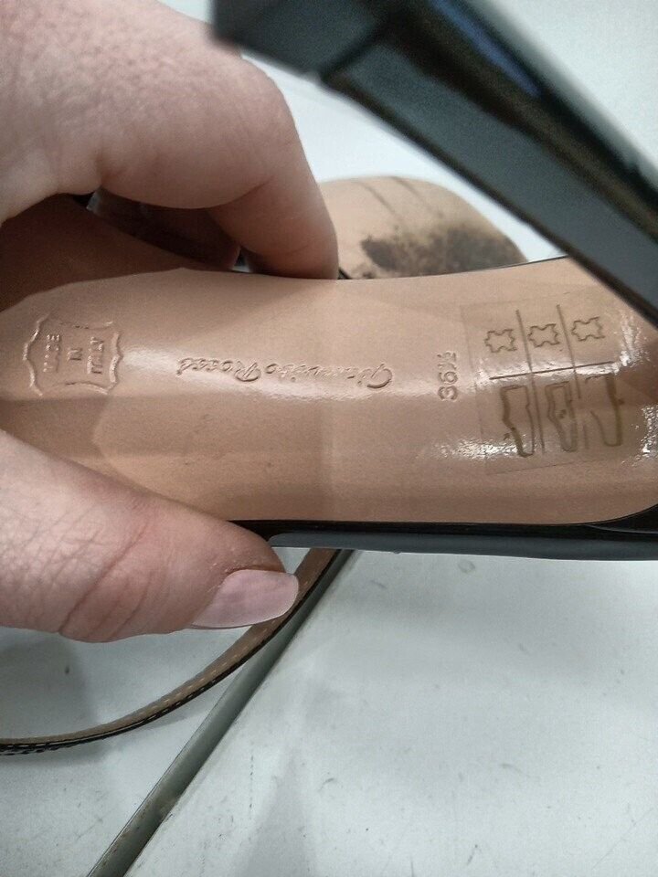 This pair is in Used condition. Please review all high-resolution photos carefully to evaluate the condition of the patent leather, heels, and soles.