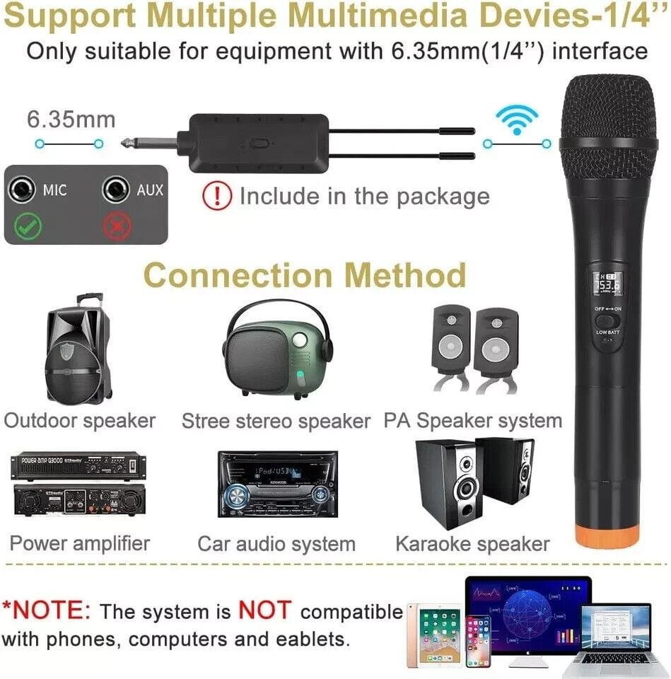* 🎤【Easy Set Up】There is no any software download needed, and the frequency has been sat up, its easy as just plug and play, no required pairing. Superior signal stability, compatible with karaoke machine, powered speaker, amplifier, mixer, audio interface. (NOTE: the system is not compatible with phones, computers and tablets.)