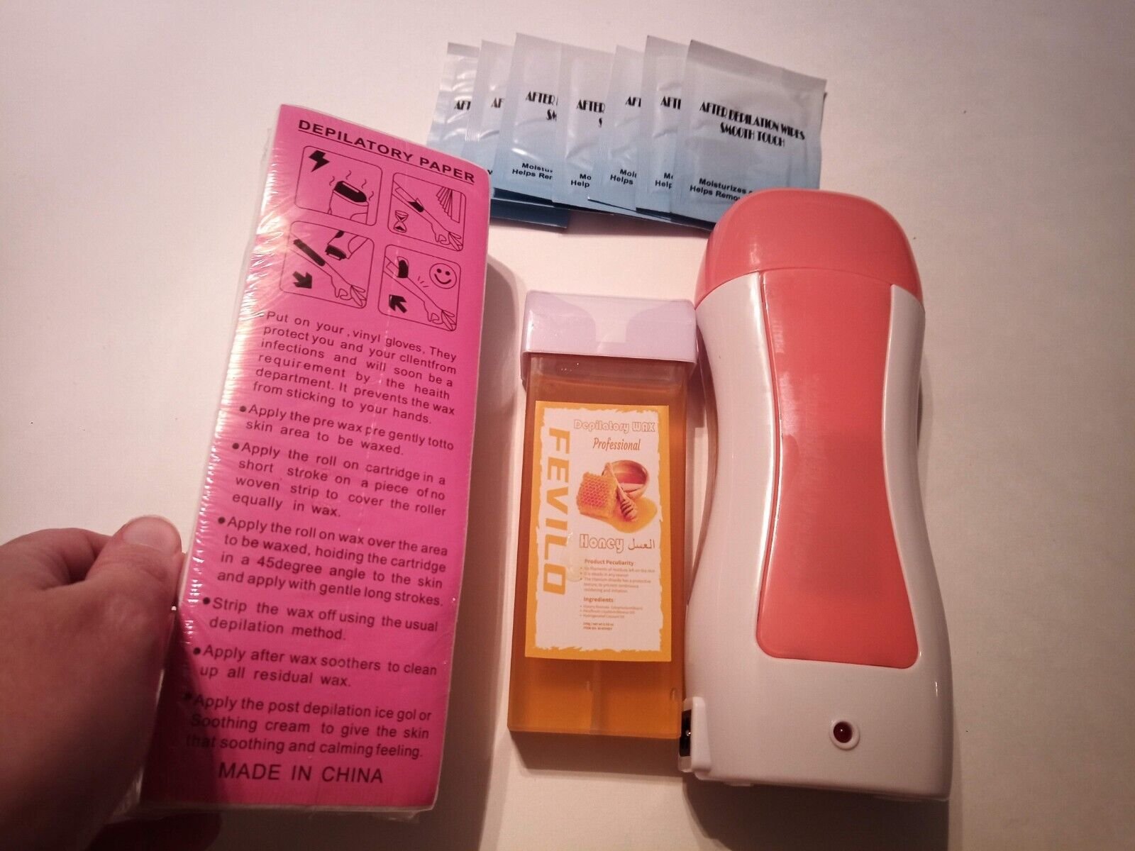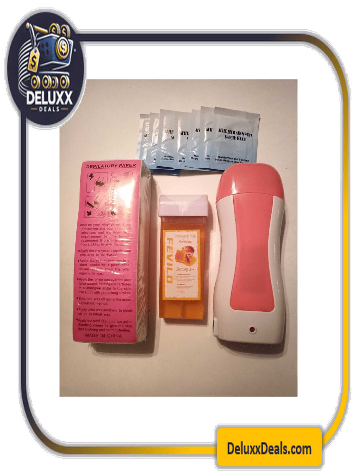 Roll-on wax kit including wax warmer, 1 Honey soft wax cartridge, depilatory papers, and after-wax wipes.