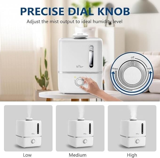 • Adjustable Humidity Control: Features a simple dial to customize the mist output, allowing you to find the perfect moisture level for any room size.