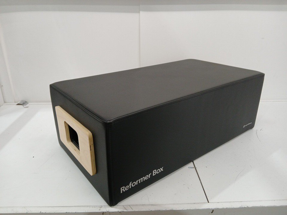 Merrithew STOTT PILATES Reformer Box (Standard Size). Essential Reformer accessory that provides additional height for optimal sitting and greater range of motion for torso and limb work. Includes adjustable padded footstrap. New, Open Box condition.