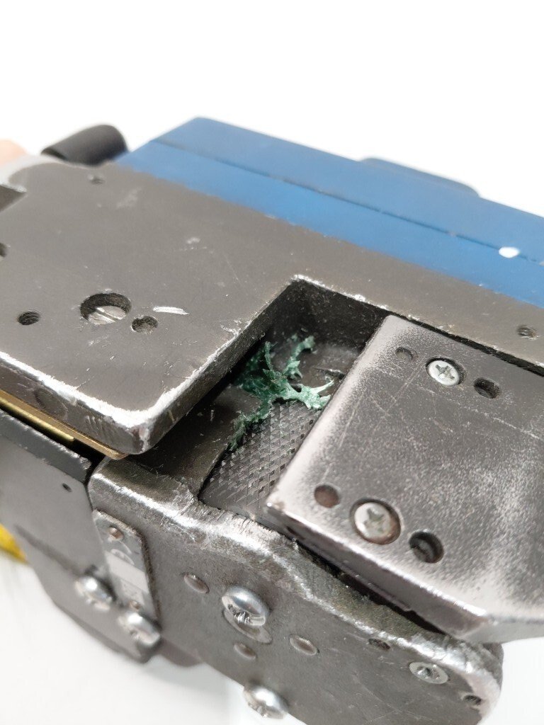 Clean the Gripper Wheel: In used tools, the most common cause of “slipping” is a build-up of plastic dust on the tension gripper wheel. Since this unit is used, we recommend using a brass wire brush to clean the teeth of the tension wheel and the friction welding plate before your first use to ensure maximum grip and seal strength.