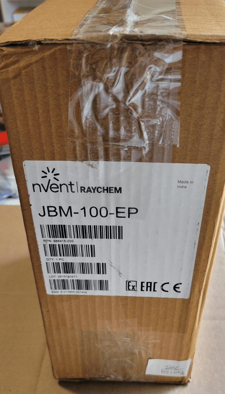Raychem JBM-100-EP Multiple Entry Power/Tee Connection Junction Box. Integrated solution for connecting up to three nVent RAYCHEM BTV, QTVR, XTV, KTV, or VPL industrial heating cables. Approved for use in hazardous locations and features cold applied installation. New Open Box with integrated rugged stand.